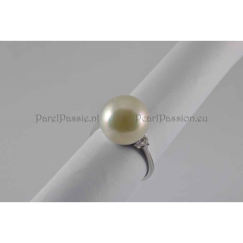 Zuidzee parelring heel grote witte echte zoutwater parel ca.12,4mm doorsnee, mooie AA kwalliteit. Zilveren ring maat 18 - 18,5 = 57 a 58 met 2 kristalletjes als briljant geslepen.